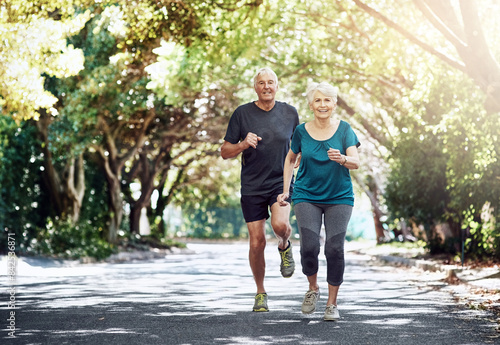 Fototapeta premium Running, outdoor and old couple with fitness, healthy and cardio with...