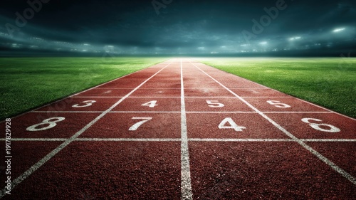 Fototapeta premium Running track perspective leading to horizon under dramatic sky, competition...