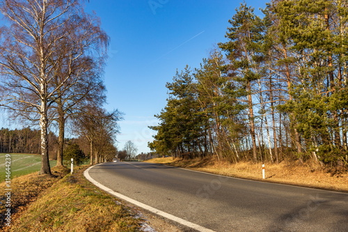 Fototapeta premium Rural asphalt road. Snowless winter in Czech countryside.