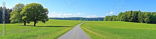 © Ilja, Fototapeta premium Rural asphalt road stretching into the distance, through green fields, under a blue sky