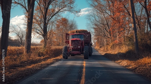 © hana, Obraz premium Rural autumn scene with a vintage tractor on a countryside lane