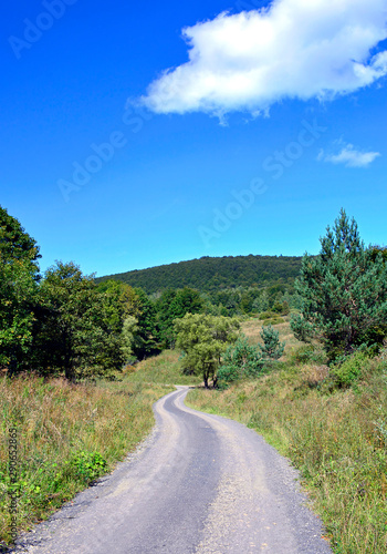 © Jurek Adamski, Fototapeta premium Rural country road in a grassy meadow on a blue sky with white clouds background