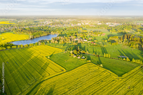 Fototapeta premium Rural Countryside Rapeseed Fields from Above in Sunny Spring Evening