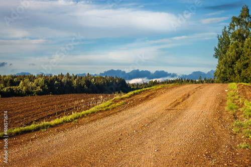 Fototapeta premium Rural dirt road with traces of agricultural machinery.