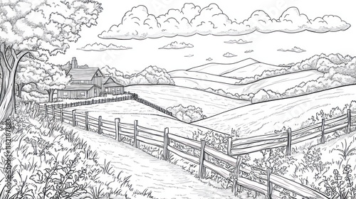 © joo, Fototapeta premium Rural Farm Scene Sketch Rolling Hills, Fence, Farmhouse
