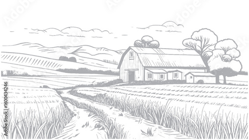 Fototapeta premium Rural Farm Scene with Barn and Fields