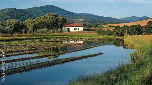 © Almahyra, Fototapeta premium Rural farmhouse reflecting in flooded farmland, hills