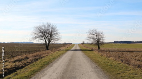 Fototapeta premium Rural gravel road vanishing point, trees, fields.