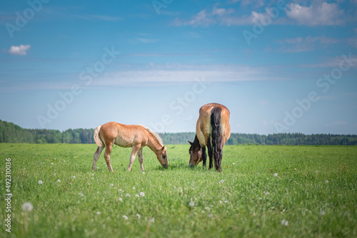 © shymar27, Fototapeta premium Rural horses graze on the collective farm field in the summer.