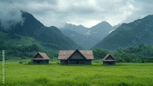 © nuttapong, Obraz premium Rural houses amidst lush green mountains