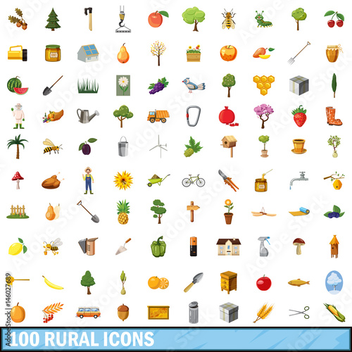© ylivdesign, Fototapeta premium 100 rural icons set, cartoon style