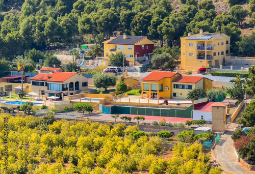 Fototapeta premium Rural landscape, aerial view. Villa in mountains. Farmhouse with garden...