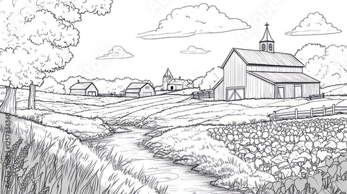 Fototapeta premium Rural landscape, creek, barn, church, farmland; idyllic scene for coloring book