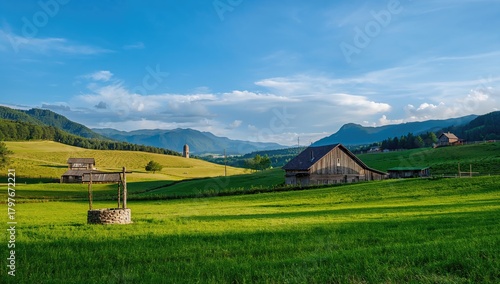 © AkuAku, Obraz premium Rural landscape featuring wooden structures and a well amidst a vibrant green field, preservation
