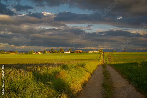 © Adam Sadlak, Obraz premium Rural landscape in Switzerland, cultivated fields.