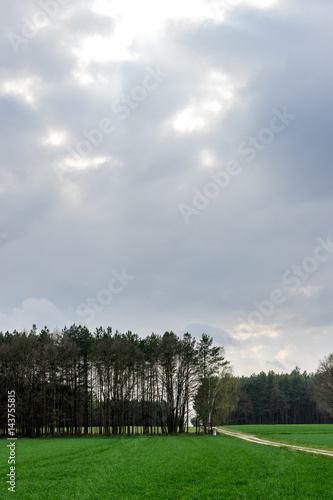 Fototapeta premium Rural landscape, meadow, forest and cloudy sky