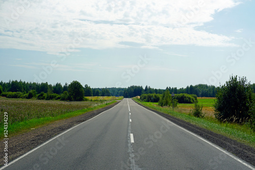 © Anatoliy, Fototapeta premium Rural landscape. The road through the fields and forests, stretching beyond the horizon. perspective lines