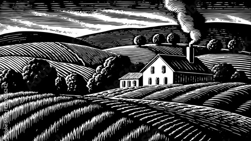 © Ethan, Fototapeta premium Rural landscape with a farm in engraving black and white hand drawn sketch outline