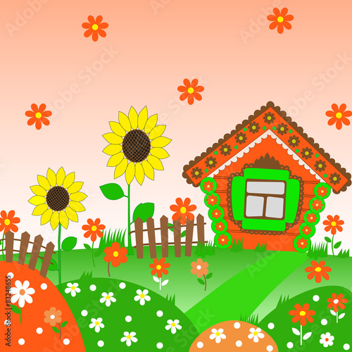 Fototapeta premium Rural landscape with a lodge and sunflowers