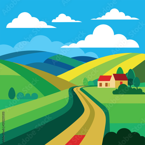Fototapeta premium rural-landscape-with-green-fields--road-and-blue-c(2).eps