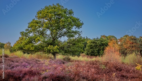 Obraz premium Rural landscape with green trees in autumn under blue sky