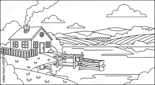 © hamzahalderad, Obraz premium Rural landscape with house, river and mountains with transparent background