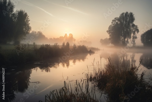 Fototapeta premium rural landscape with misty morning sunrise, featuring a peaceful lake,...