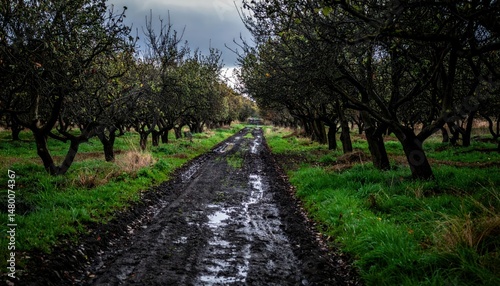 © Kitta Studio, Fototapeta premium Rural Path Through Orchard Under Cloudy Sky with Muddy Ground