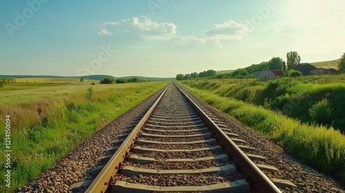Fototapeta premium Rural railway track vanishing into horizon under blue sky.