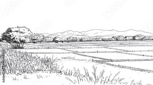 © Mundhut, Fototapeta premium Rural rice paddy landscape drawing