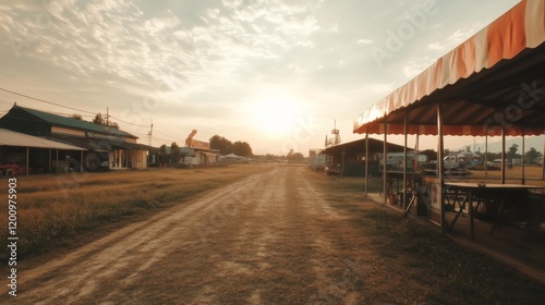 Obraz premium Rural road at sunset with stalls and buildings.