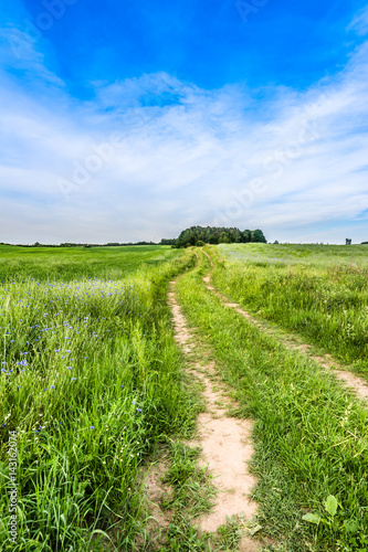 Obraz premium Rural road, field and sky, grass with cornflowers, summer landscape