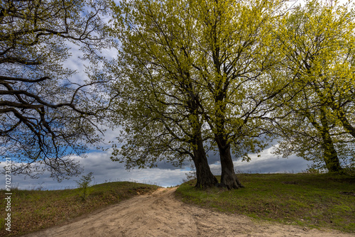 Fototapeta premium rural road in the foreground. spring landscape with trees with young greenery...
