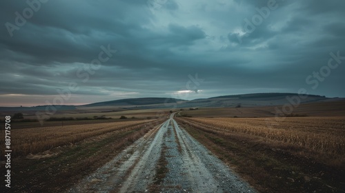 Naklejka premium Rural road stretching into distance beyond horizon among fields and hills under gray evening clouds