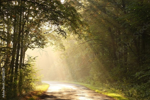 © Aniszewski, Fototapeta premium Rural road through the misty autumn forest at dawn