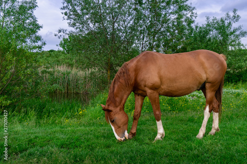 © cherry26, Obraz premium Rural Scene with A Horse Grazing Grass on A Meadow in Springtime