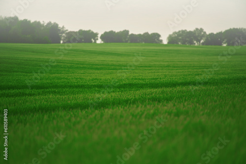 Obraz premium rural setting reflects the connection between nature and agriculture. green field stretches into the distance, forming the backdrop of the photo. vibrant green field in spring