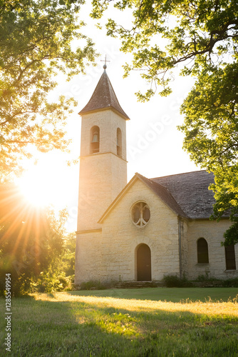 Naklejka premium Rural Stone Church With Steeple and Sunlight Streaming Through Trees Creating...