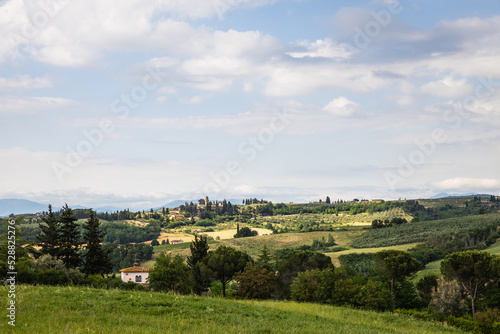 Fototapeta premium Rural view of Tuscany with rolling green hills and traditional Tuscan architecture on a partly sunny day.