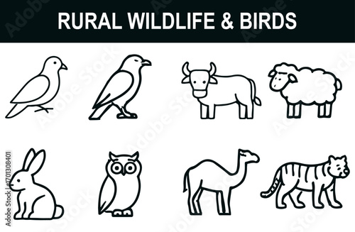 © RayZing , Fototapeta premium Rural Wildlife & Birds Icon Set – Black Line Art of Cow, Sheep, Rabbit, Owl, Camel, Tiger, Pigeon & Crow for Educational, Cultural & Biodiversity Projects