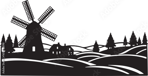 © Md, Obraz premium Rural Windmill Landscape Silhouettes