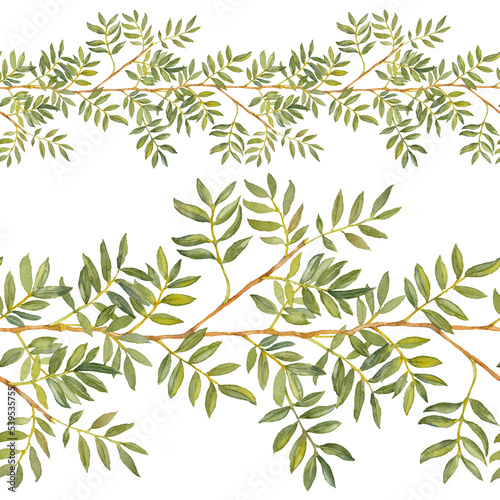 © Tatiana, Naklejka premium Ruscus. Greenery collection. Seamless border. Watercolor hand-drawn illustration on white background.