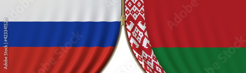 Fototapeta premium Russia and Belarus political cooperation or conflict, flags and closing or opening zipper, conceptual 3D rendering