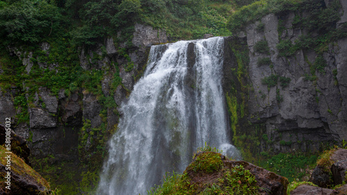 Fototapeta premium Russia, Kamchatka. A full-flowing mountain waterfall near Tolbachik volcano.