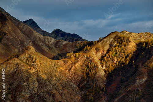 © Александр Катаржин, Fototapeta premium Russia. Mountain Altai. Expressive graphics of autumn sunlight on the rocks of mountain ranges.
