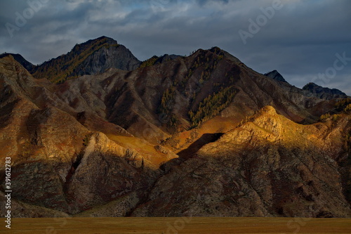 © Александр Катаржин, Fototapeta premium Russia. Mountain Altai. Illuminated by the sunset rays of the sun, the picturesque mountains along the Chui tract near the village of Inya.