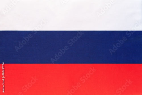 © nikol85, Naklejka premium Russia national fabric flag textile background. Symbol of international world european country.