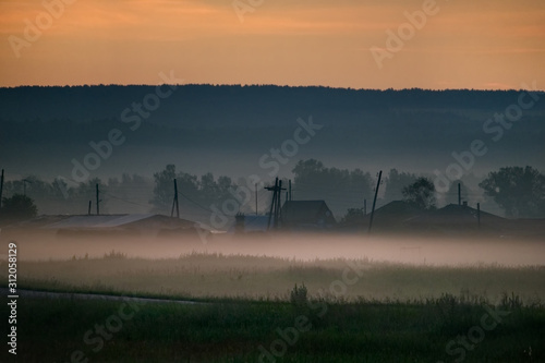 © Александр Катаржин, Fototapeta premium Russia. Republic Of Khakassia. Fog in the early summer morning in the fields near the city of Abakan.