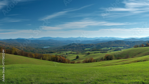 © SHALENA, Fototapeta premium russia summer landscape - green fileds, the blue sky and white c