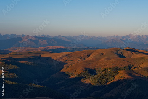 Obraz premium Russia, the Elbrus region. Stunning dawn view of the Caucasus mountains from the cliffs of the Bolshoy Bermamyt plateau.